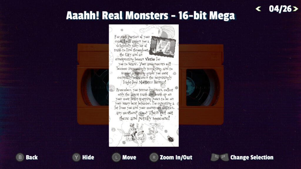 Deze functie zit gelukkig ook in de Nickelodeon Splat Pack, uitgebracht door Limited Run Games. Dat is absoluut geen overbodige luxe, want games uit de jaren negentig waren onverbiddelijk moeilijk. Deze collectie bundelt Aaahh!!! Real Monsters (zowel de Sega Mega Drive- als de SNES-versie), Rocko’s Modern Life: Spunky’s Dangerous Day en Nickelodeon Guts. Dit waren titels die voor mij vroeger in de categorie ‘onmogelijk’ vielen, maar dankzij de rewind-functie krijg ik nu eindelijk een eerlijke kans.