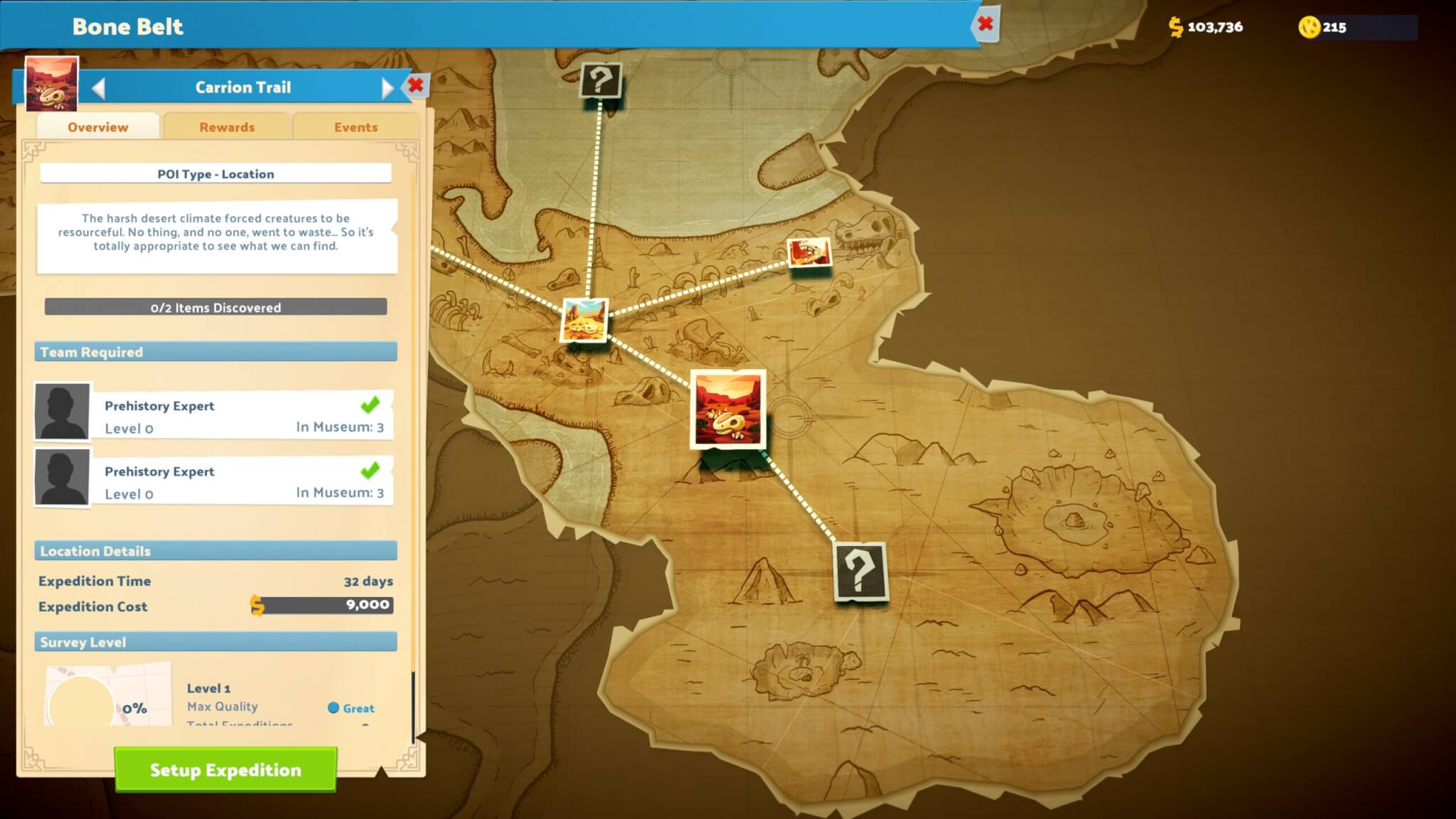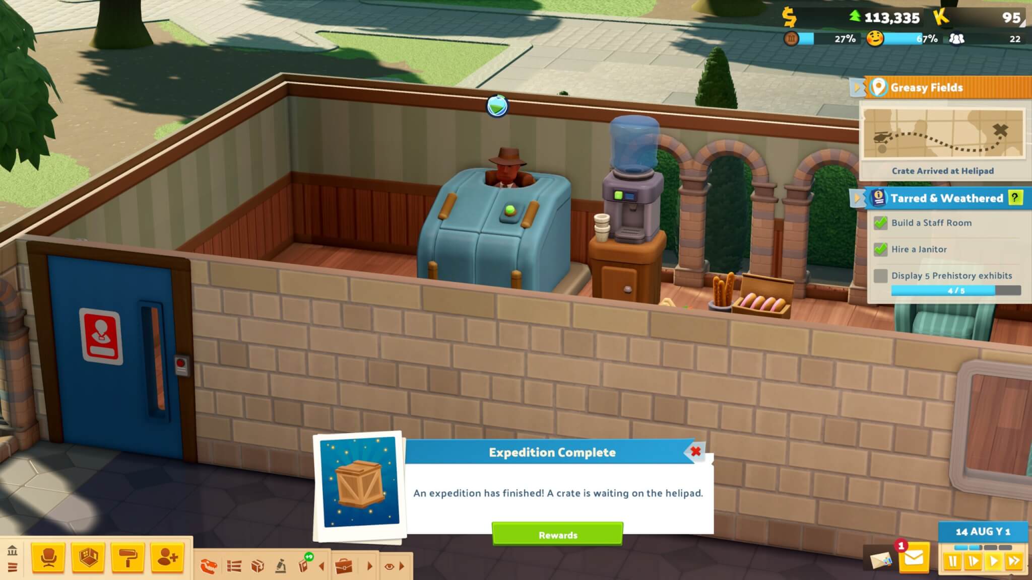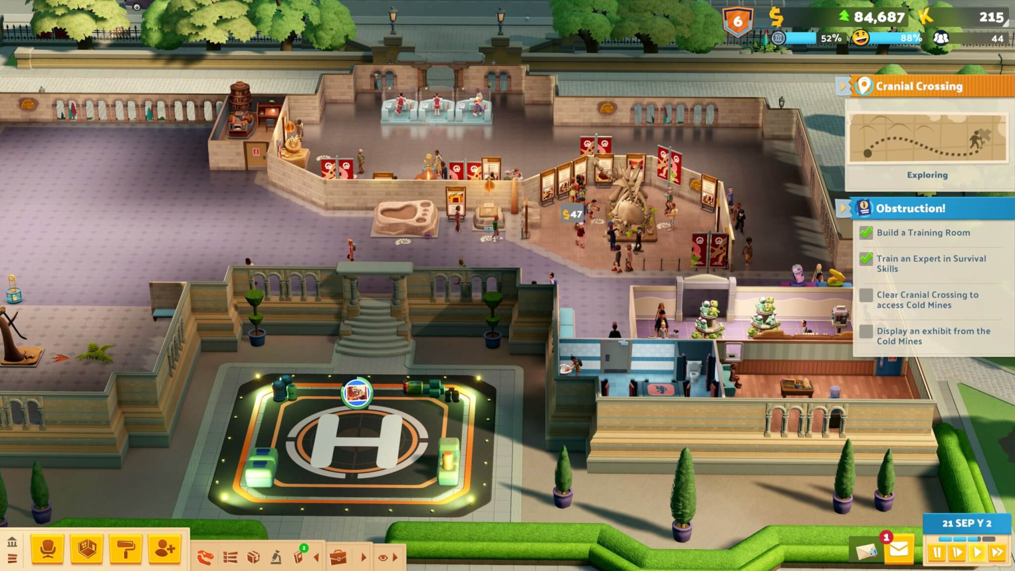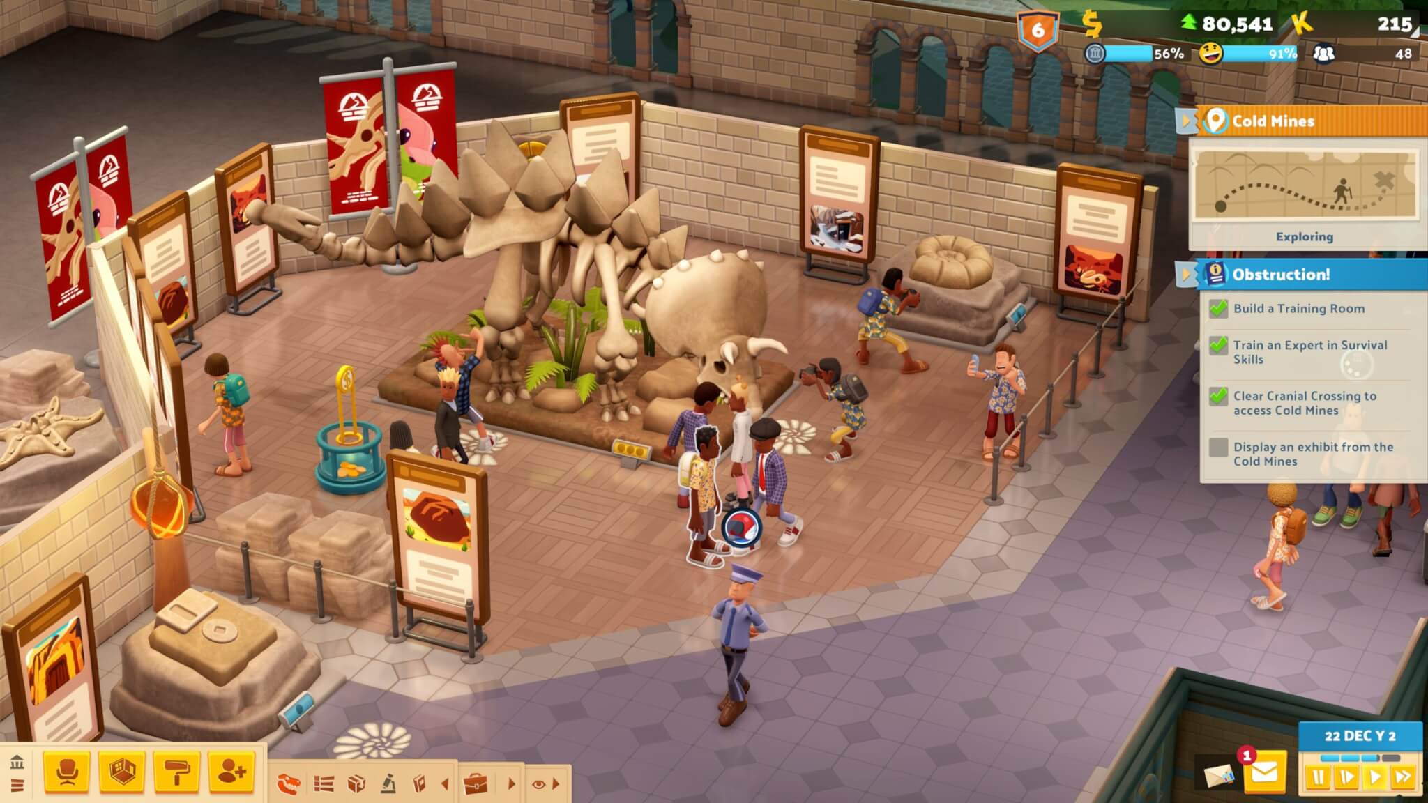 Om nieuwe stukken aan je museumcollectie toe te voegen, stuur je medewerkers op expeditie met een helikopter. Deze avonturen leveren nieuwe objecten op, maar kunnen je personeel ook problemen geven, zoals modderige voeten. Je moet dus zorgen voor een goed uitgeruste personeelskamer waarin medewerkers weer herstellen. De leuke verwijzingen naar eerdere titels, zoals Two Point Hospital, zorgen daarbij voor een extra glimlach.